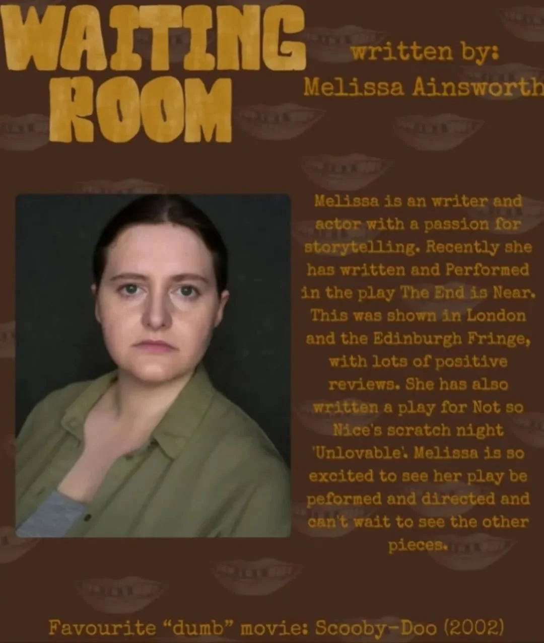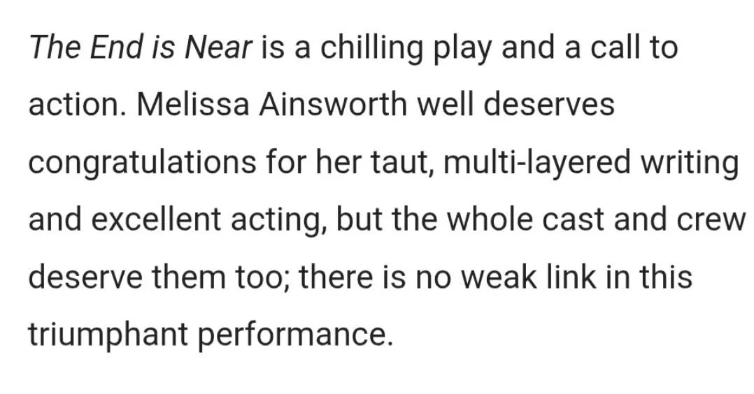 Melissa is an actor and writer who has been in numerous performances from stage to screen to radio. She recently has written and has performed in The End is Near, which premiered at the Edinburgh Fringe and later went to London.